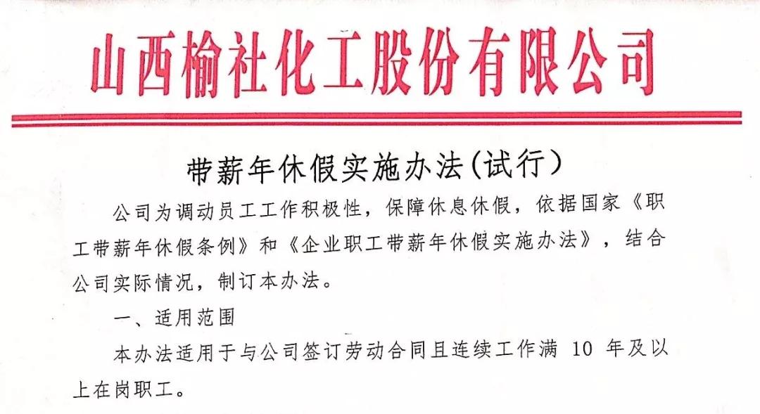 在试行期间,将按实际遇到的问题再做细化调整,把“带薪休假”制度落实好,完善好。在公司发展壮大同时,让员工享受公司发展的成果,有更多时间陪伴父母子女,外出旅游,调整自身身心状态。榆化员工定能感受到公司的关怀和温暖,以实际行动回馈公司,与公司同舟共济,再创佳绩。(董书君)
