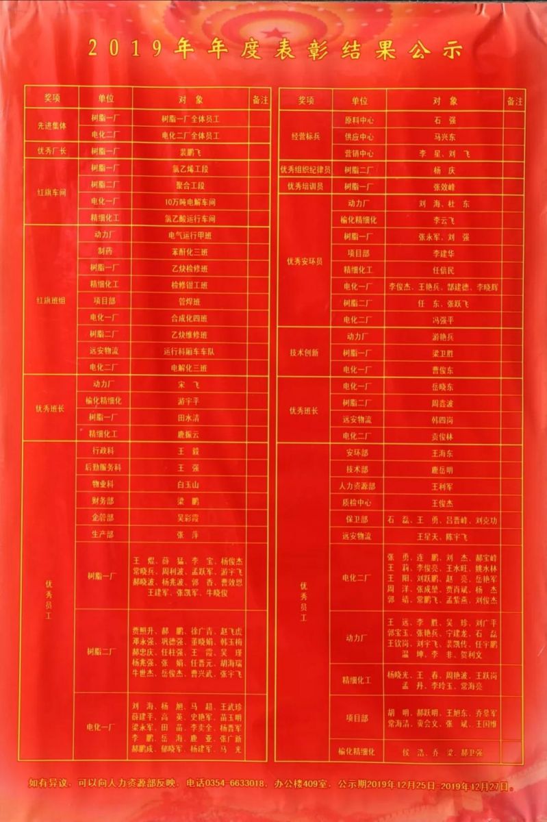 12月24日,公司人力资源部组织董事会、监事会、经理层和各厂部负责人在三楼会议室举行2019年度表彰评定会议。
