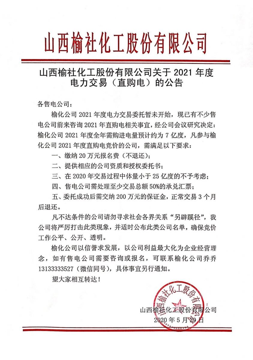 榆化公司关于2021年度电力交易(直购电)的公告