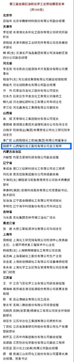 1月15日,第三届全国石油和化学工业先进集体、劳动模范和先进工作者表彰大会采用线上线下相结合的方式在京召开。会上,人力资源和社会保障部、中国石油和化学工业联合会表彰了81个单位“全国石油和化学工业先进集体”、105名“全国石油和化学工业劳动模范”、10名“全国石油和化学工业先进工作者”。公司总工程师田建平被授予“全国石油和化学工业劳动模范”称号,享受省部级劳模待遇。