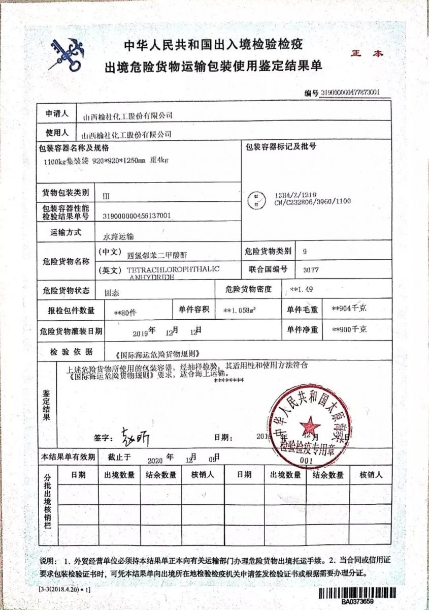 榆化精细化于今年12月初开始筹划主导产品(四氯邻苯二甲酸酐)的出口事宜。